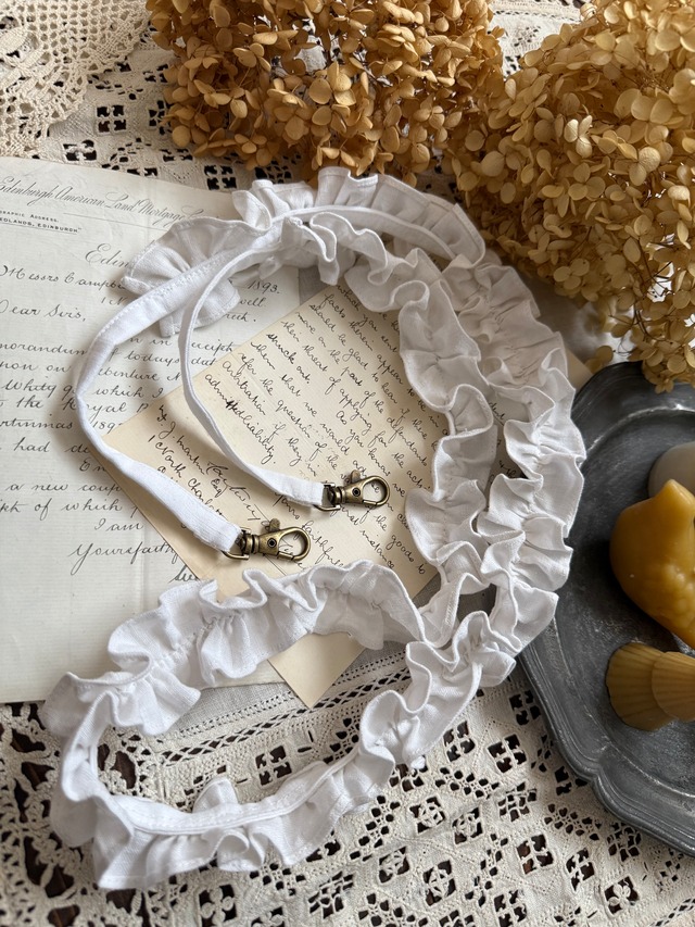【カラー】 ホワイト 【素 材】 生地 アンティークリネン100% 【サイズ】 FREE 全長(金具含め) 123㎝ 紐部分の長さ 117㎝ フリルの幅 約4㎝ 【商品の特徴】 アンティークリネンのやわらかな風合いに、 くしゅっとしたフリルが可憐に揺れる── colorerならではの、《大人のための“フリルショルダー》に仕上がりました♡ このショルダーは、携帯ストラップやポシェットの紐として使える実用性も兼ね備えつつ、 コーデにさりげなく“ときめき”を添えてくれる特別なアイテム♡ アンティークリネンのもつ、時間を重ねた生地だけが纏う くったりとした風合いと、どこか儚いクラシカルな表情が魅力です。 定番のすずらんポシェットやカゴポシェットにもぴったり♡ もちろん、スマートフォンの肩掛けショルダーとしてもおすすめです^ ^ ホワイト・スミクロの2色展開で、 可愛さの中にも品があり、大人の装いにもすっと馴染んでくれます 他ではなかなか出会えない、アンティーク素材とデザインの組み合わせを、 ぜひあなただけの“好き”としてお迎えくださいね♡ ※サイズにご注意ください。 また、お使いの携帯やPCによっては、商品画像の色味と実物の色味が 異なる場合もあるため、ご了承くださいませ。 ※ハンドメイドのため、出来上がりのサイズが数ミリ〜2㎝前後誤差が 生じる可能性がございます。ご了承くださいませ。 【お手入れのポイント】 ⚪︎洗濯の際は、中性洗剤をご使用ください。 ⚪︎洗濯機で洗う際には、洗濯ネットに入れておしゃれ着モードなどで 洗っていただくことをおすすめします。 ⚪︎注意点として、柔軟剤や漂白剤の使用はお控えください。 また、乾燥機のご使用は避けてください。 ⚪︎形を整えて陰干ししてください。