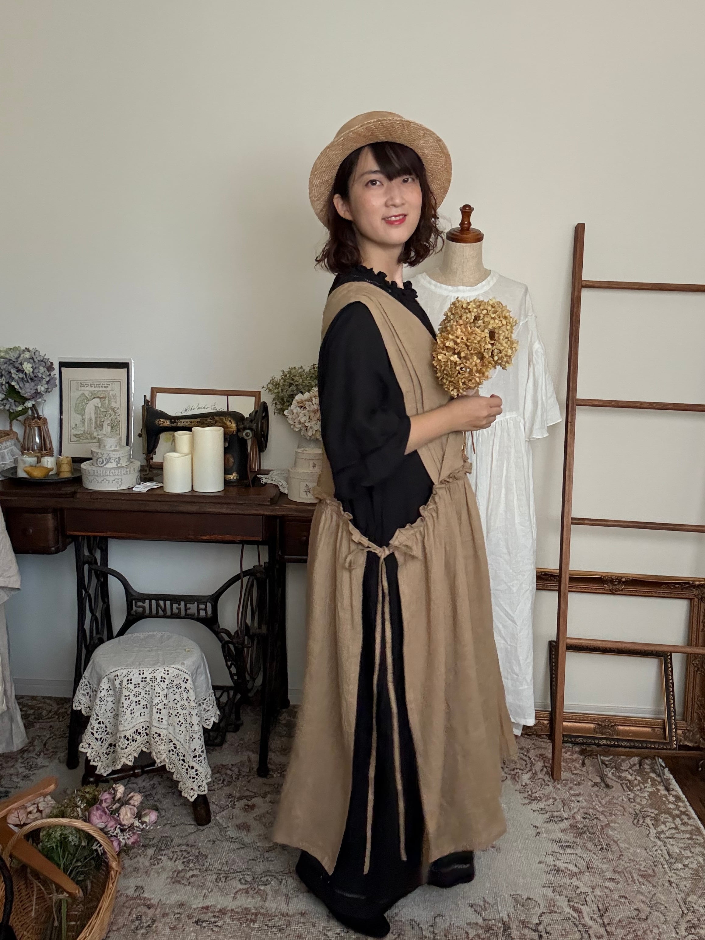 【カラー】ブラック 【素 材】フレンチリネン100% 【サイズ】フリーサイズ 着丈 120㎝(バックネックポイントから採寸) ウエスト 140㎝ 身幅 70㎝ アームホール 50㎝ 首周り 52㎝ ※規格着丈120㎝以外の場合は、以下のオーダー料金が 追加でかかります。 <オーダー料金> 100、105、110、115㎝:+1000円 【商品の特徴】 タブリエと重ねて、もっと毎日がときめく♡ 夏にぴったりの涼しさと可愛さを兼ね備えた タブリエにぴったりな、こだわりのワンピースができました^ ^ 〈こだわりポイント〉 ① 涼しさと可愛さを両立したフレア袖 風をふわりと通す軽やかさ。動くたびに優しく揺れて、 可憐な印象をプラスしてくれます。 ② 前後の見ごろに印象的なV字ライン 一枚で着てもエレガントに。 重ね着してももたつかず、 大人の可愛さをさりげなく引き立てます。 ③ 後ろ姿もときめく、贅沢なくるみボタン 背中に並ぶ5つのくるみボタンが、さりげないアクセントに。 後ろ姿まで愛おしくなるデザインです。 ④ つけ襟の重ねづけにも◎ シンプルな丸襟 首元はあえてすっきりとした丸襟に。 お手持ちのつけ襟とも好相性で、アレンジが楽しめます。 ⑤ 締めつけ感ゼロの、ゆったり身幅 ストレスフリーな着心地を叶える、ゆったりとしたシルエット。 体型問わず、ふんわりと包み込みます。 ⑥ 気になる二の腕&肘もカバーする絶妙な袖丈 涼しさはありつつも、露出しすぎず安心。 夏にうれしいバランス感のある袖丈です。 ⑦ あるとうれしい、両サイドポケット付き スマホやハンカチなどもさっと入れられて、実用性もばっちり◎ ⑧ タブリエとの相性も抜群な丈感 裾からちらりとレースが覗いたり、絶妙なバランスでレイヤードが 楽しめるマキシ丈に仕上げました。 洋裁歴40年以上の母と縫製チームが、 一着ずつ裁断から丁寧に仕上げた、こだわりのワンピース。 風をふわりと通すフレア袖、 シンプルで重ね着しやすい丸襟、 後ろ姿まで可愛い5つのくるみボタンなど、 細部まで“着る楽しさ”を大切に仕立てました♡ 締め付けのないゆったりとした身幅、 気になる二の腕や肘まで隠れる袖丈で、 暑い夏もストレスフリーにおしゃれが楽しめます^ ^ 前後の見ごろにはV字ラインを入れて、 一枚で着てもレイヤードしても映えるデザインに。 さらに、両サイドには便利なポケットつき。 タブリエと重ねることを想定した、 “レイヤードが映える丈感”にもこだわりました。 動くたびにふんわり揺れるシルエットは、 まるで絵本の主人公のように自然体で可憐な雰囲気を演出してくれます♡ 使用しているのは、通気性がよく、さらっと肌になじむ上質なフレンチリネン。 着るほどに柔らかさが増し、あなたに寄り添う一枚へと育っていきます。 親から子へ、子から孫へと受け継がれるような、 心を込めて作ったワンピースをあなたへ。 お手持ちのタブリエやつけ襟と合わせて、 季節を楽しむ“わたしらしい”装いに。 着るたびにときめきが広がる一枚を、 あなたの日常にお届けします♡ ※サイズにご注意ください。 また、お使いの携帯やPCによっては、商品画像の色味と実物の色味が異なる場合もあるため、 ご了承くださいませ。 ※ハンドメイドのため、出来上がりのサイズが数ミリ〜2㎝前後誤差が生じる可能性が ございます。ご了承くださいませ。 【お手入れのポイント】 ⚪︎洗濯の際は、中性洗剤をご使用ください。 ⚪︎洗濯機で洗う際には、洗濯ネットに入れておしゃれ着モードなどで 洗っていただくことをおすすめします。 ⚪︎注意点として、漂白剤の使用はお控えください。 また、乾燥機のご使用は避けてください。 ⚪︎形を整えて陰干ししてください。